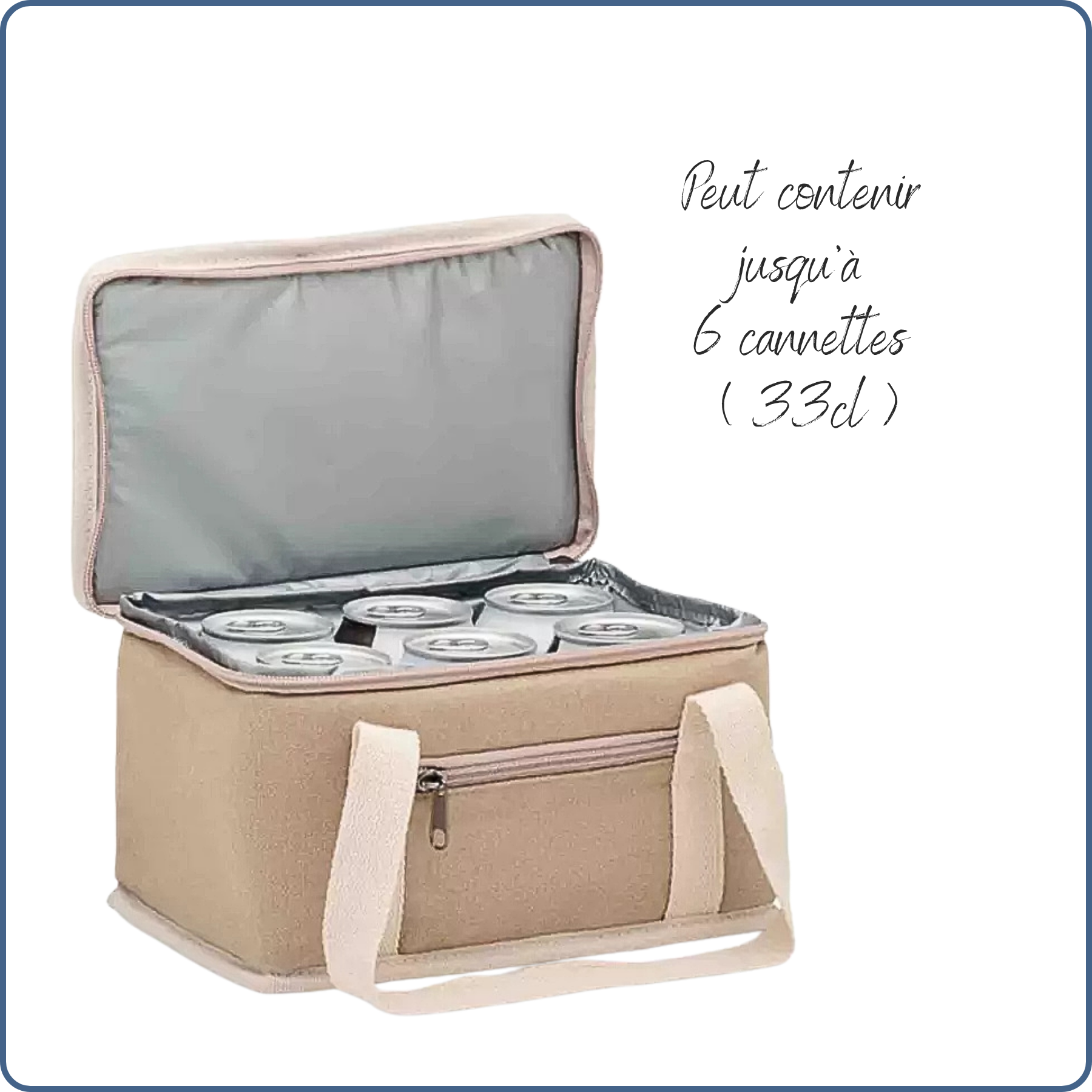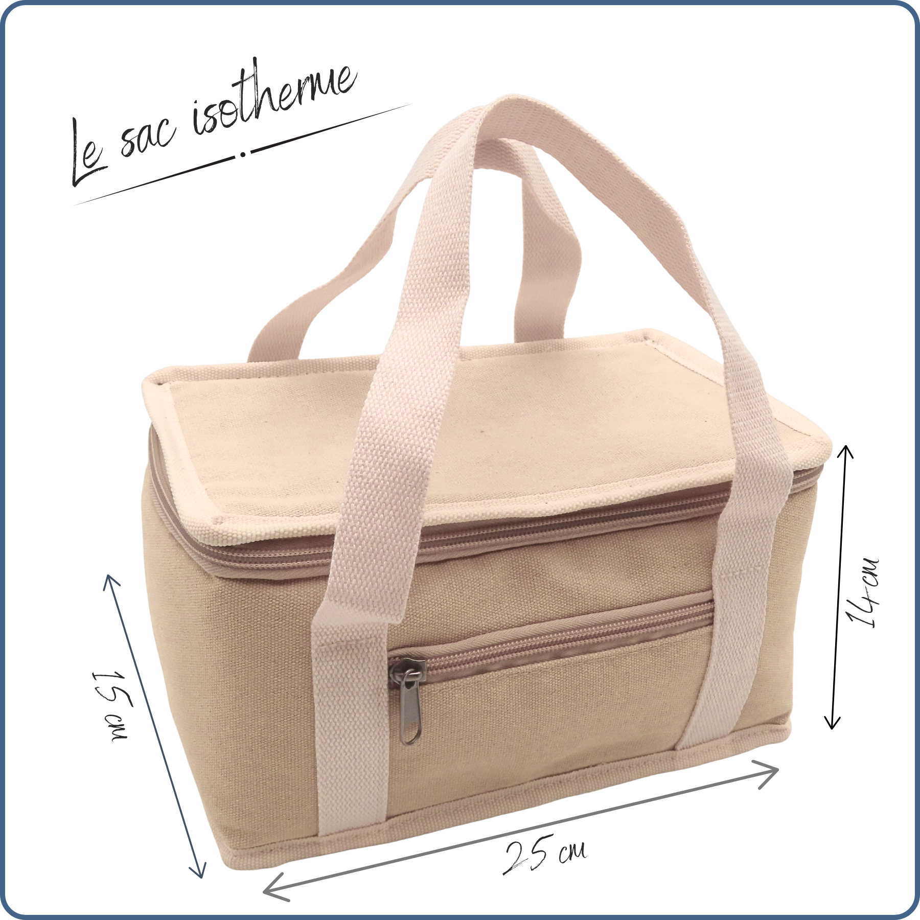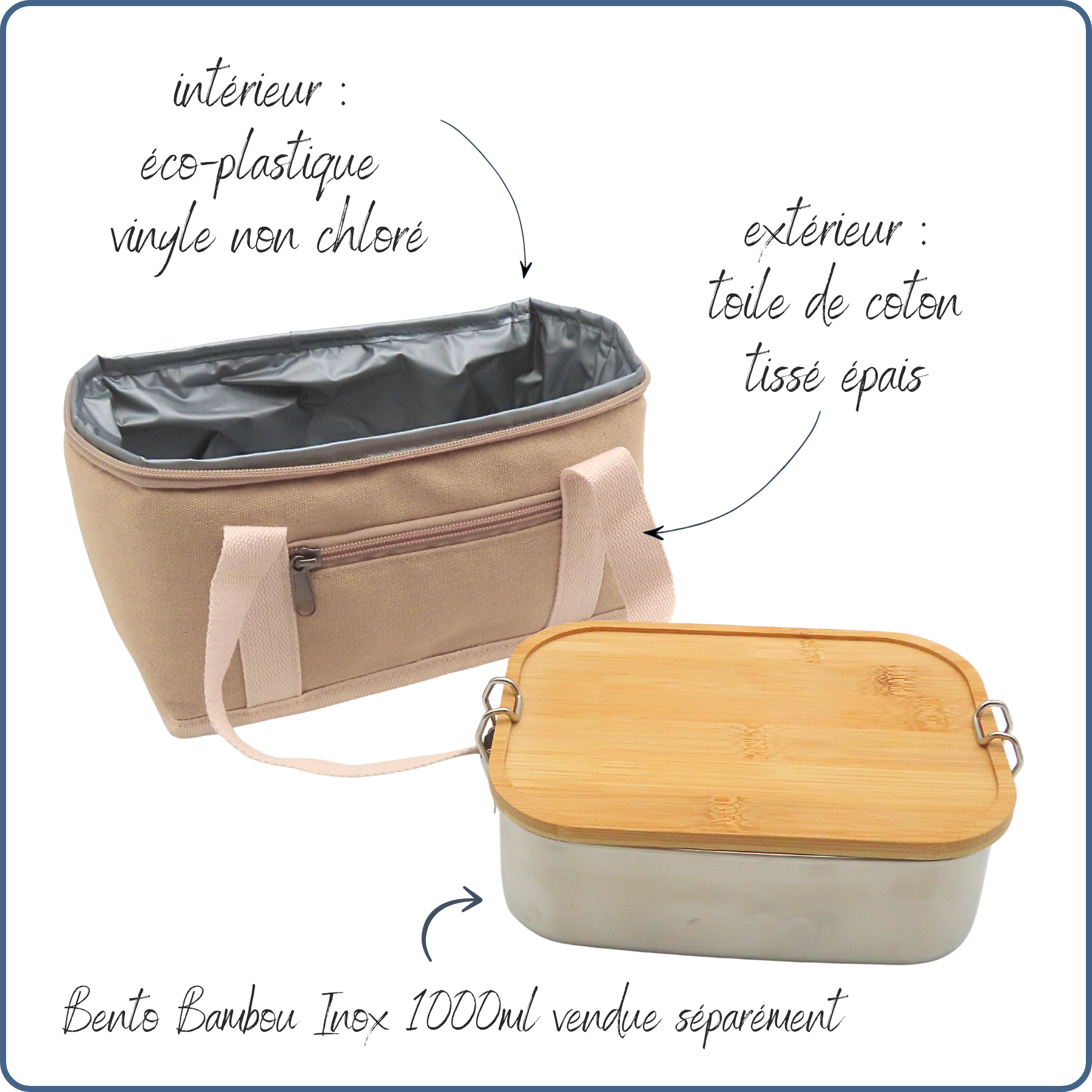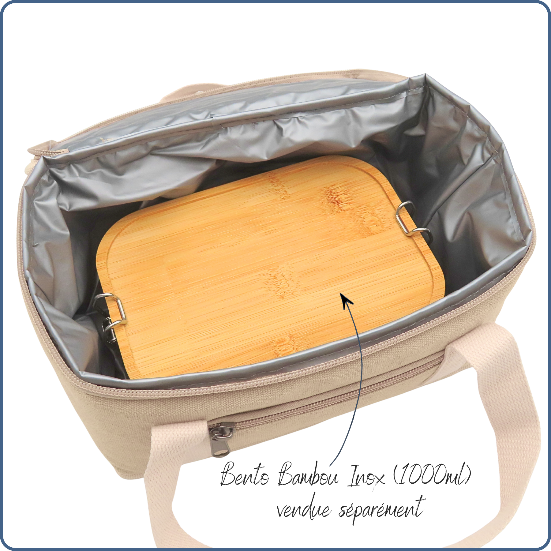 Ce sac peut contenir 2 boites Bento Bambou/Inox comme celle présente sur les visuels, ou 6 canettes 33cl. La boite Bento Bambou/Inox est vendue séparément dans notre gamme Inox.