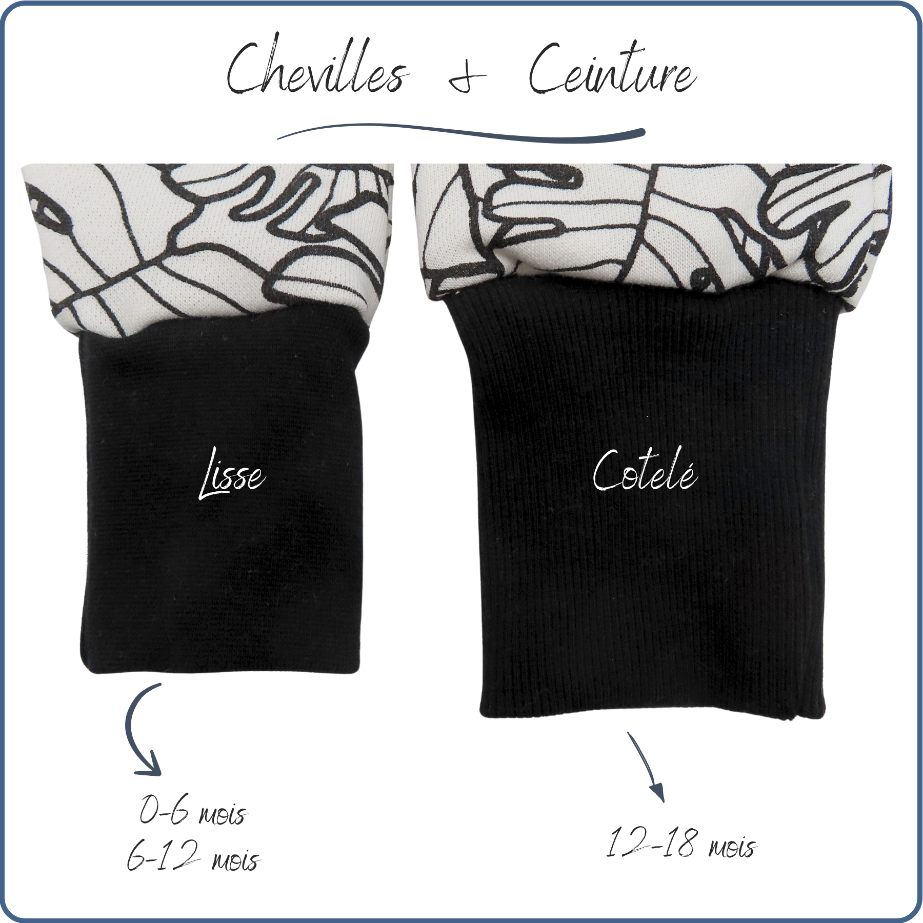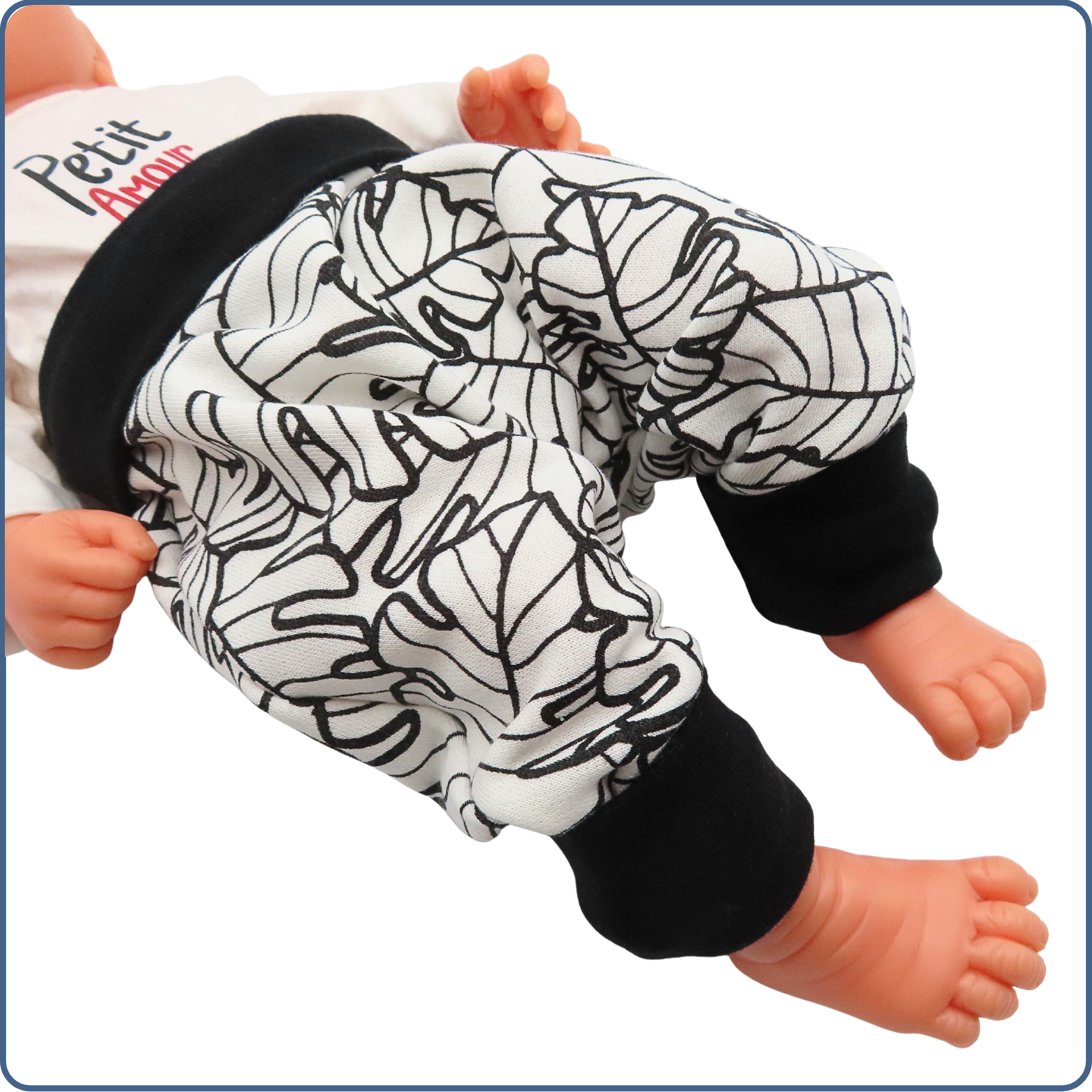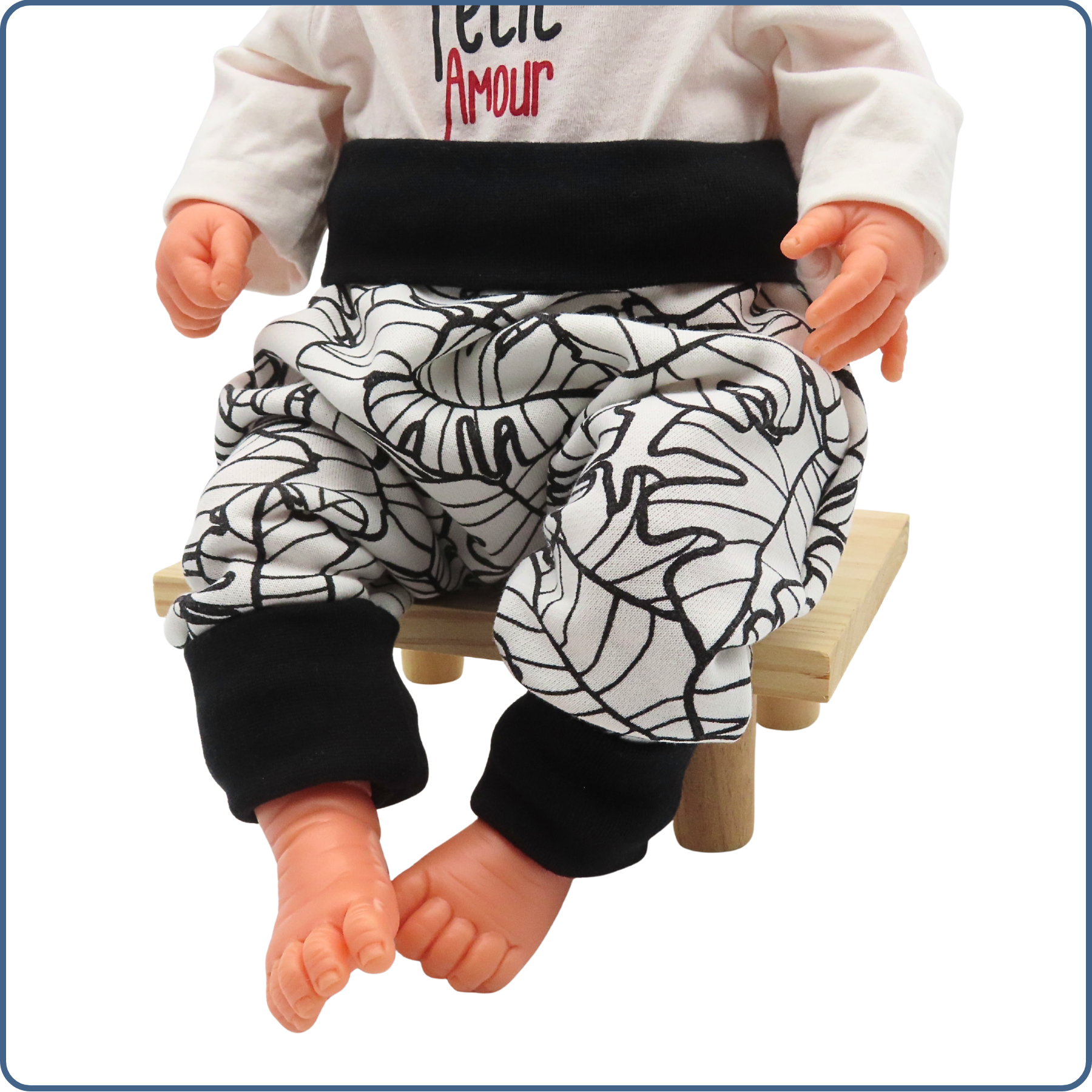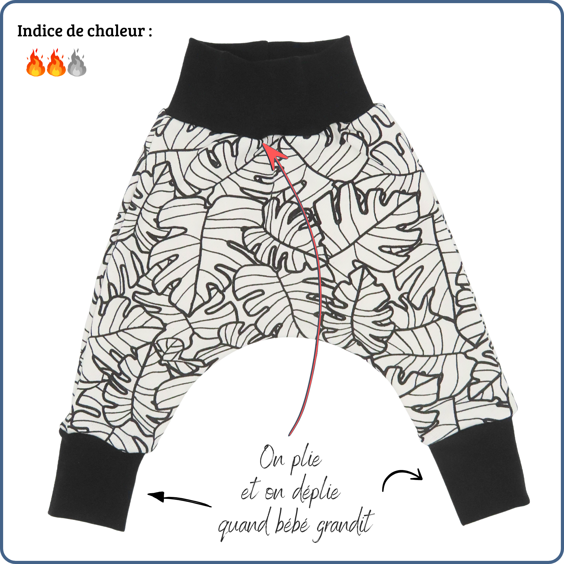 sarouel évolutif bébé, très chaud, motif végétal, feuilles noir et blanc, économique, tissu sans produitSarouel évolutif